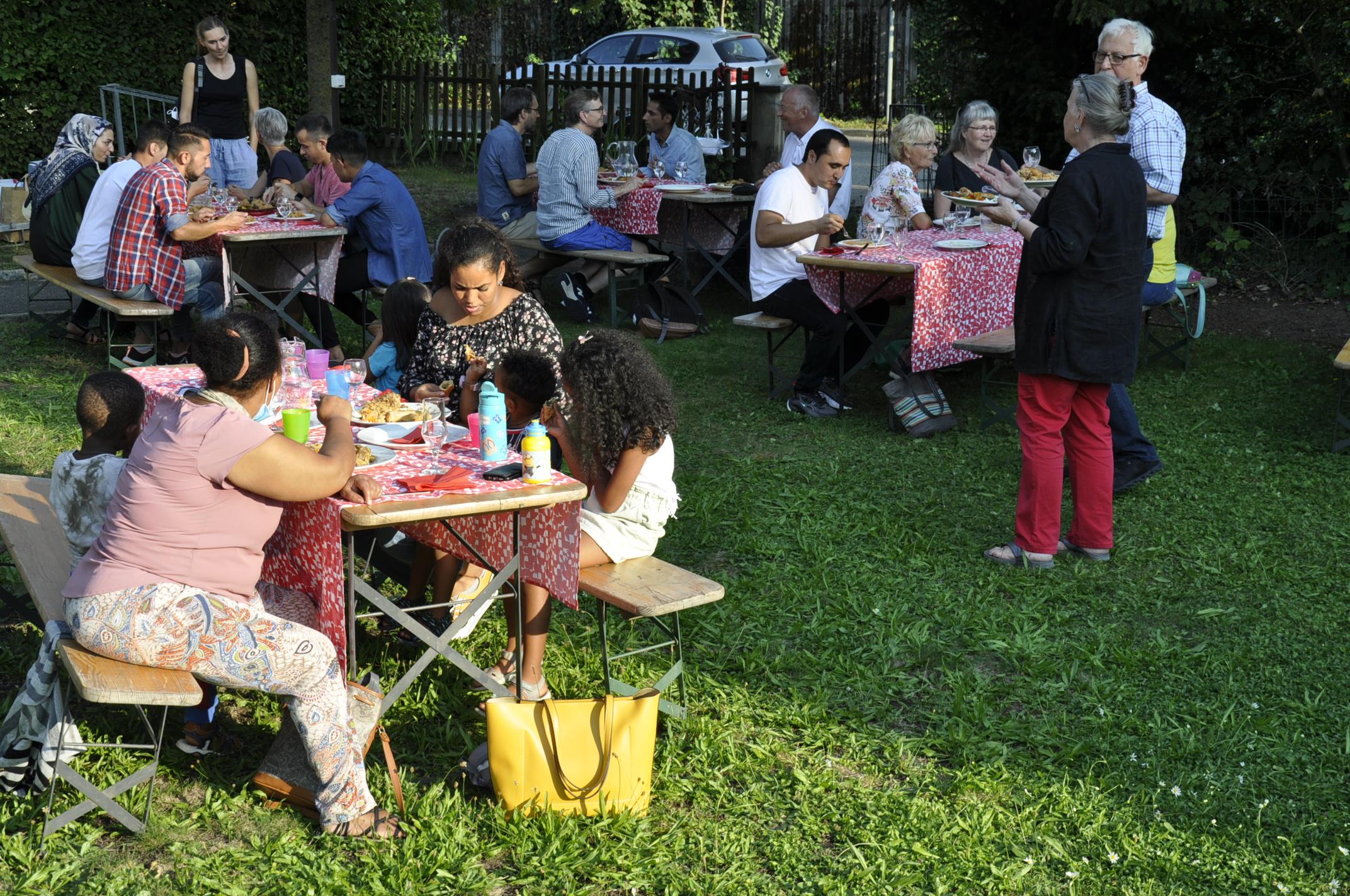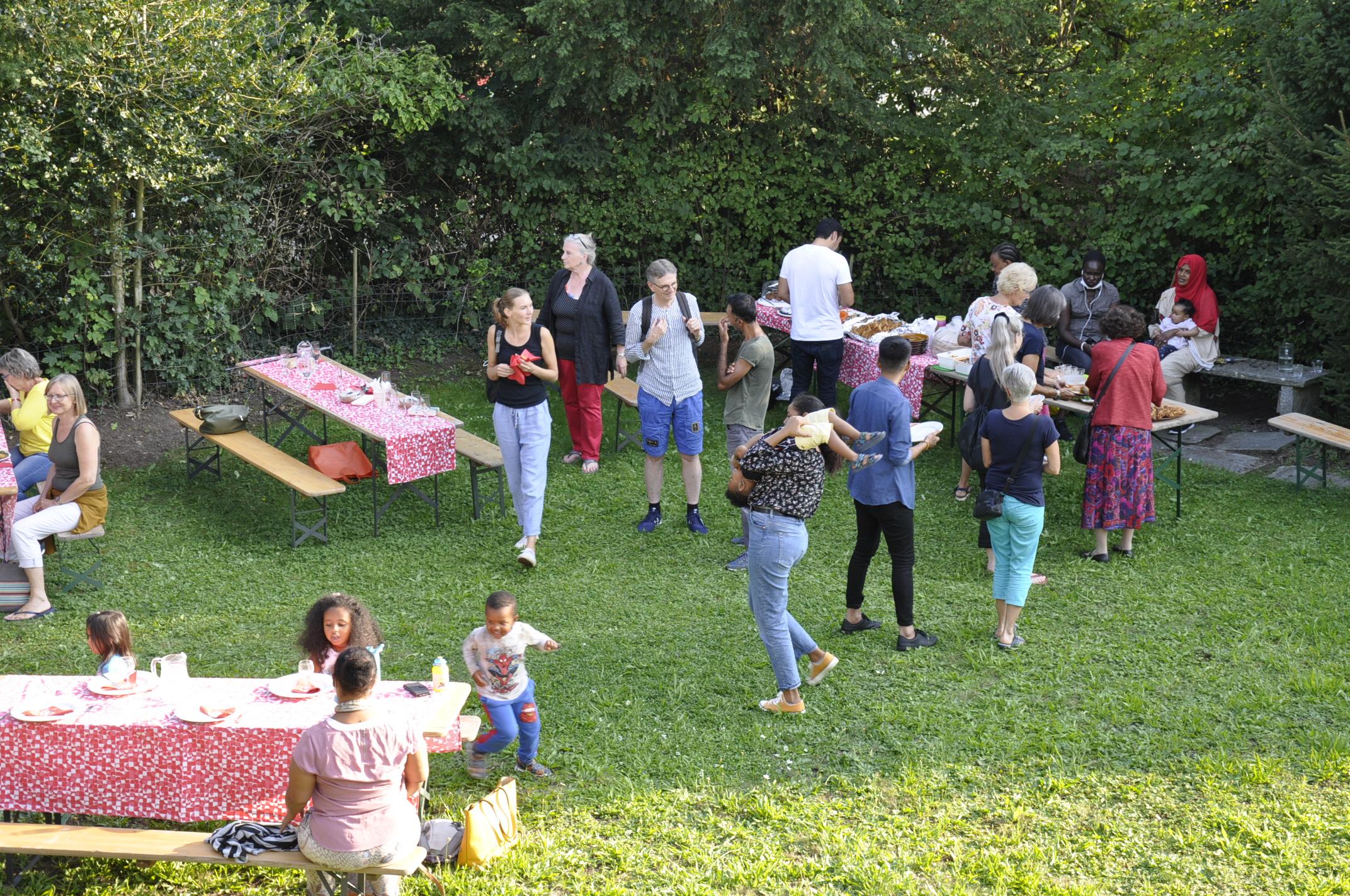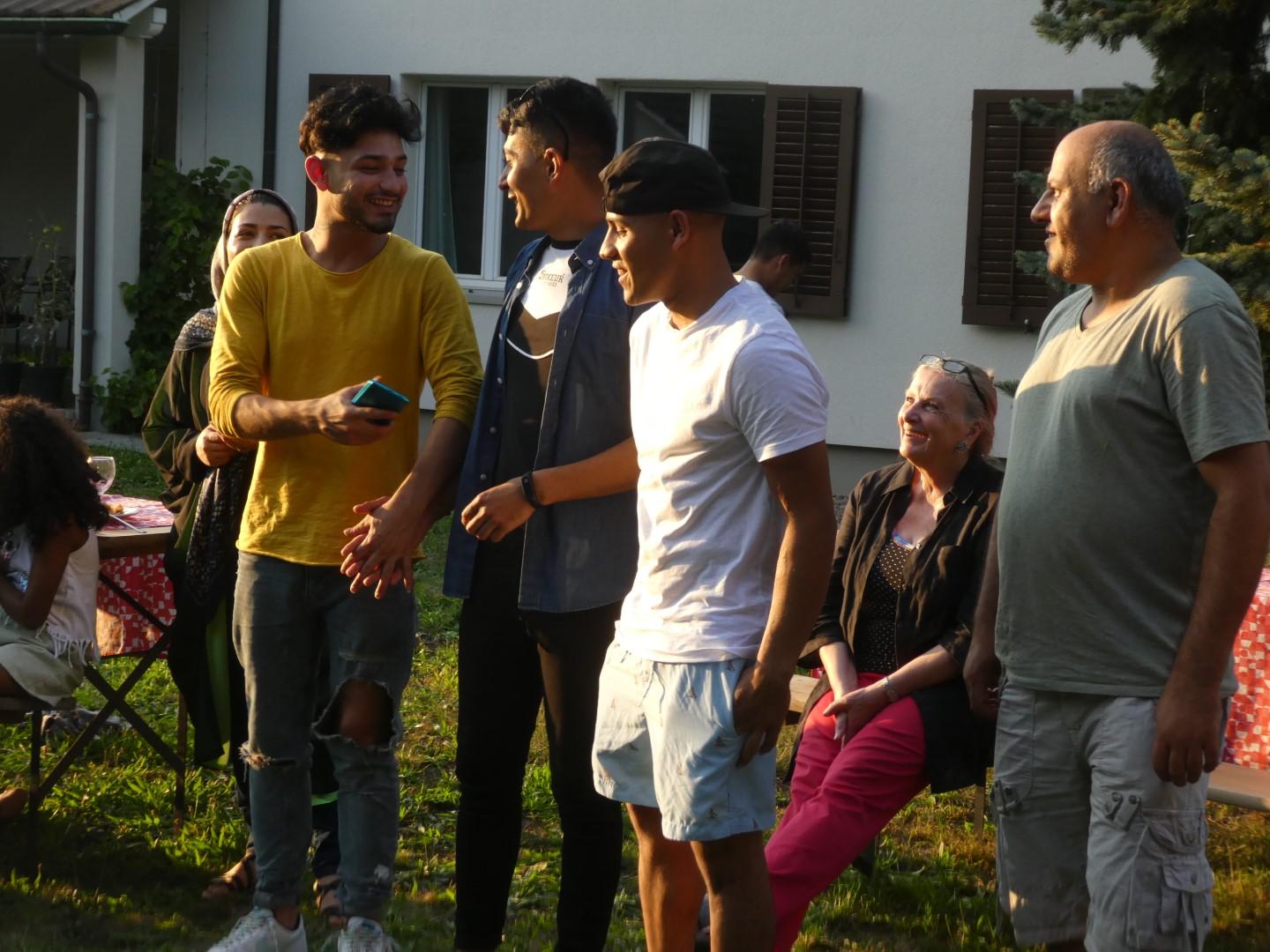 Eine Schar von dreissig Kindern und Erwachsenen – Geflüchtete aus Afghanistan, Eritrea, Somalia, Syrien und anderen Ländern sowie ihre hiesigen Mentorinnen und Mentoren – traf sich an einem lauen Spätsommerabend bei uns im Pfarrhausgarten.