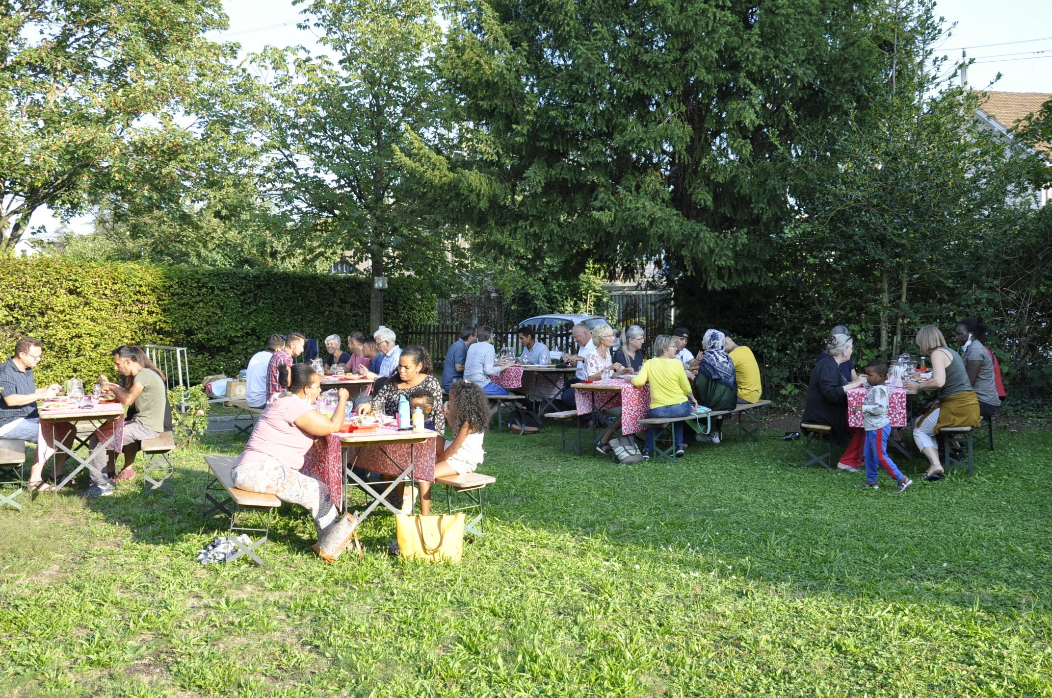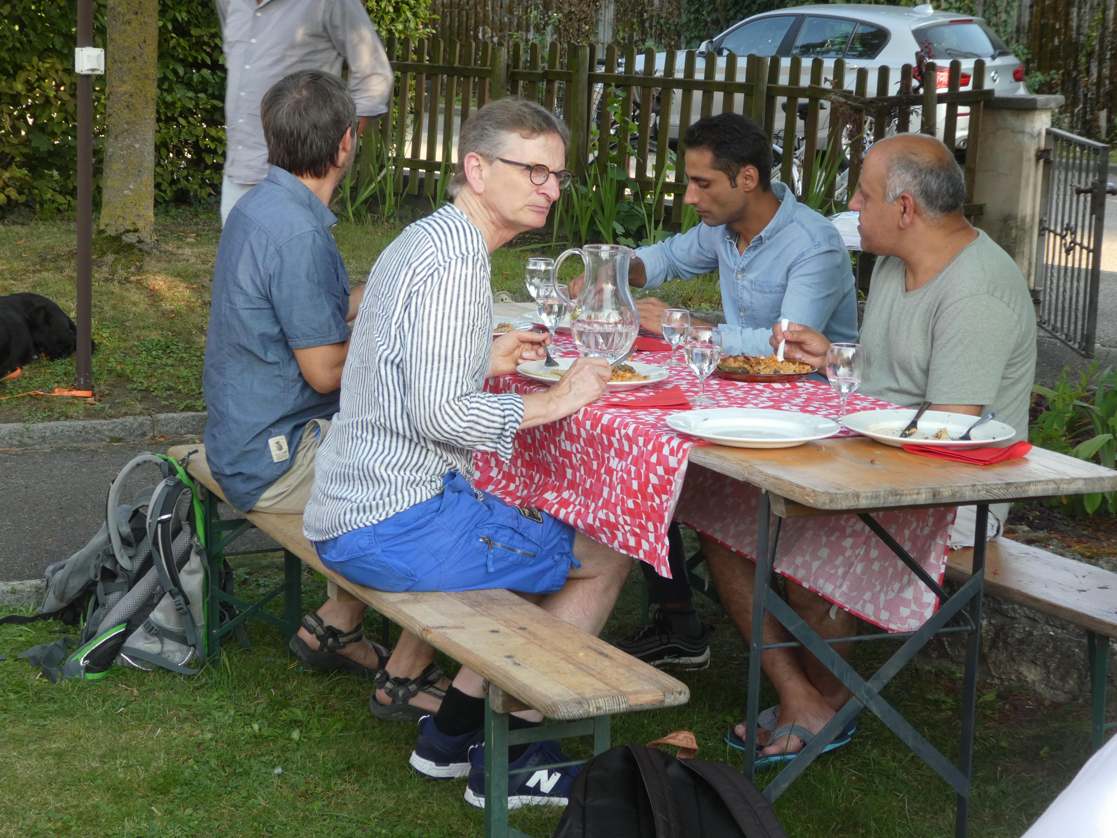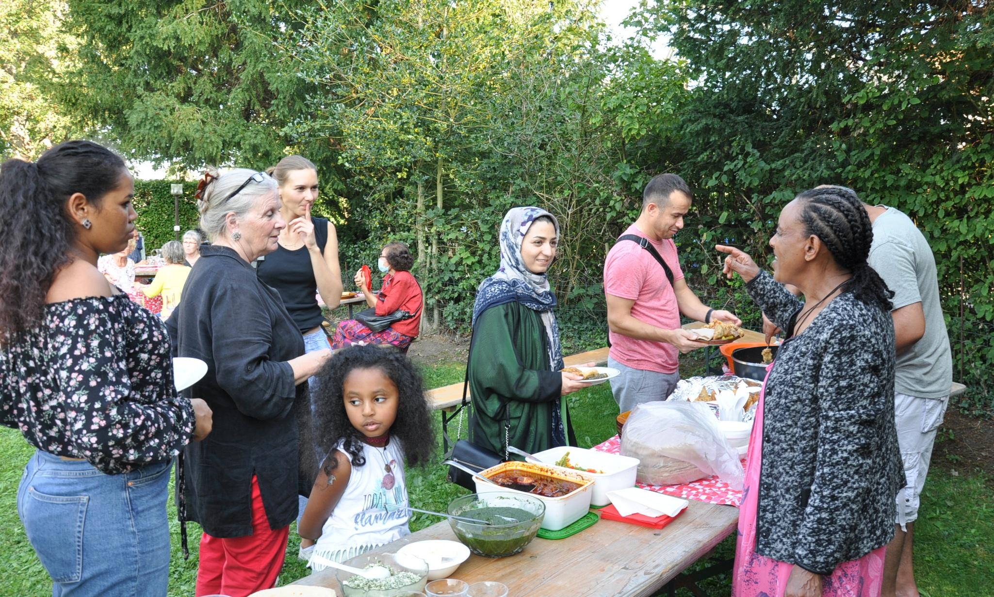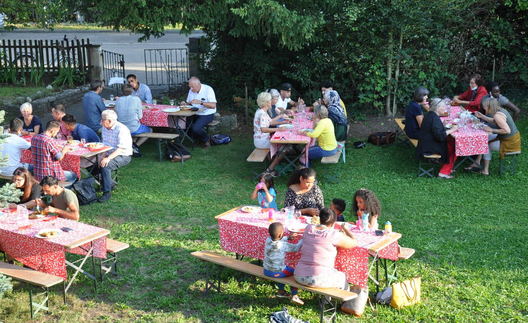 Eine Schar von dreissig Kindern und Erwachsenen – Geflüchtete aus Afghanistan, Eritrea, Somalia, Syrien und anderen Ländern sowie ihre hiesigen Mentorinnen und Mentoren – traf sich an einem lauen Spätsommerabend bei uns im Pfarrhausgarten.