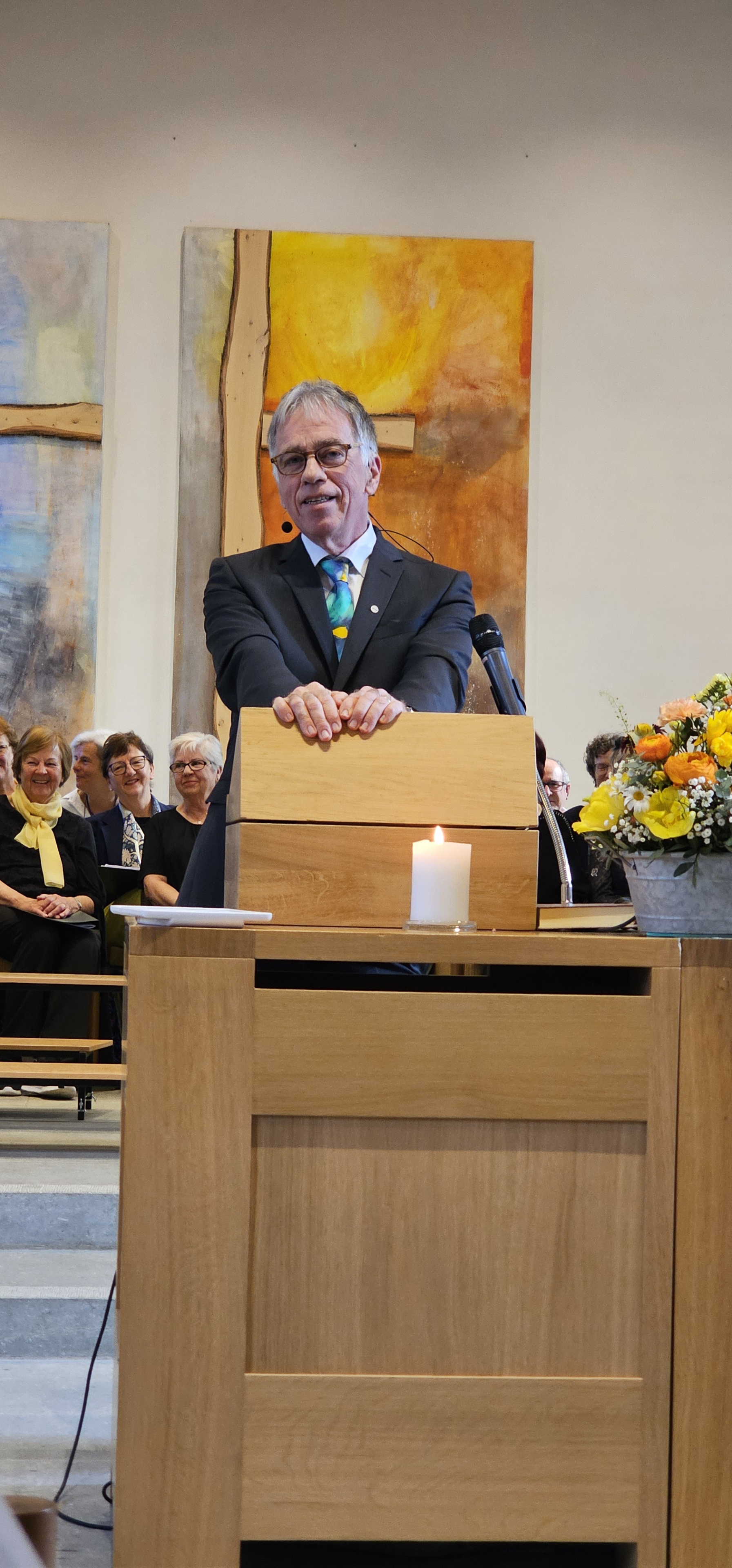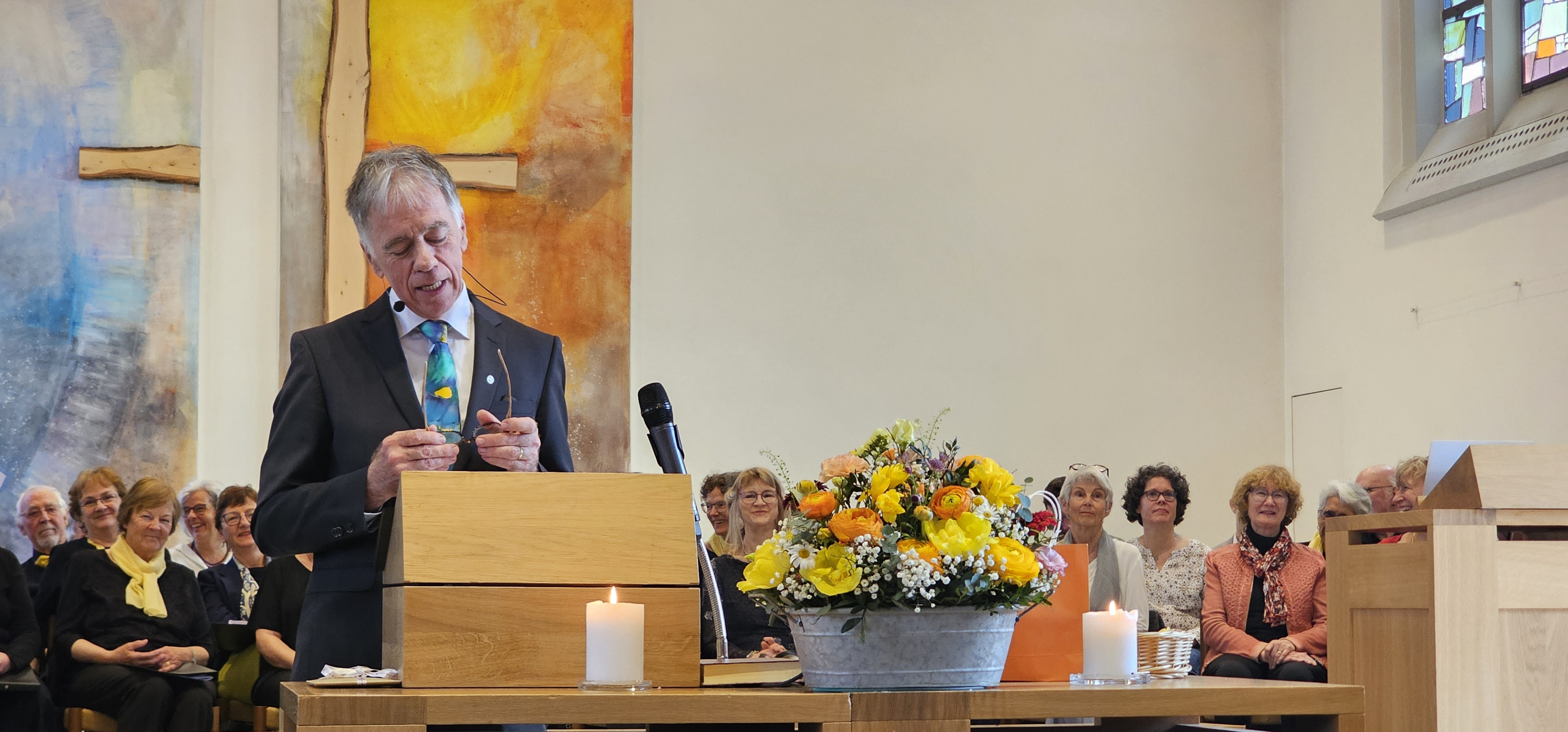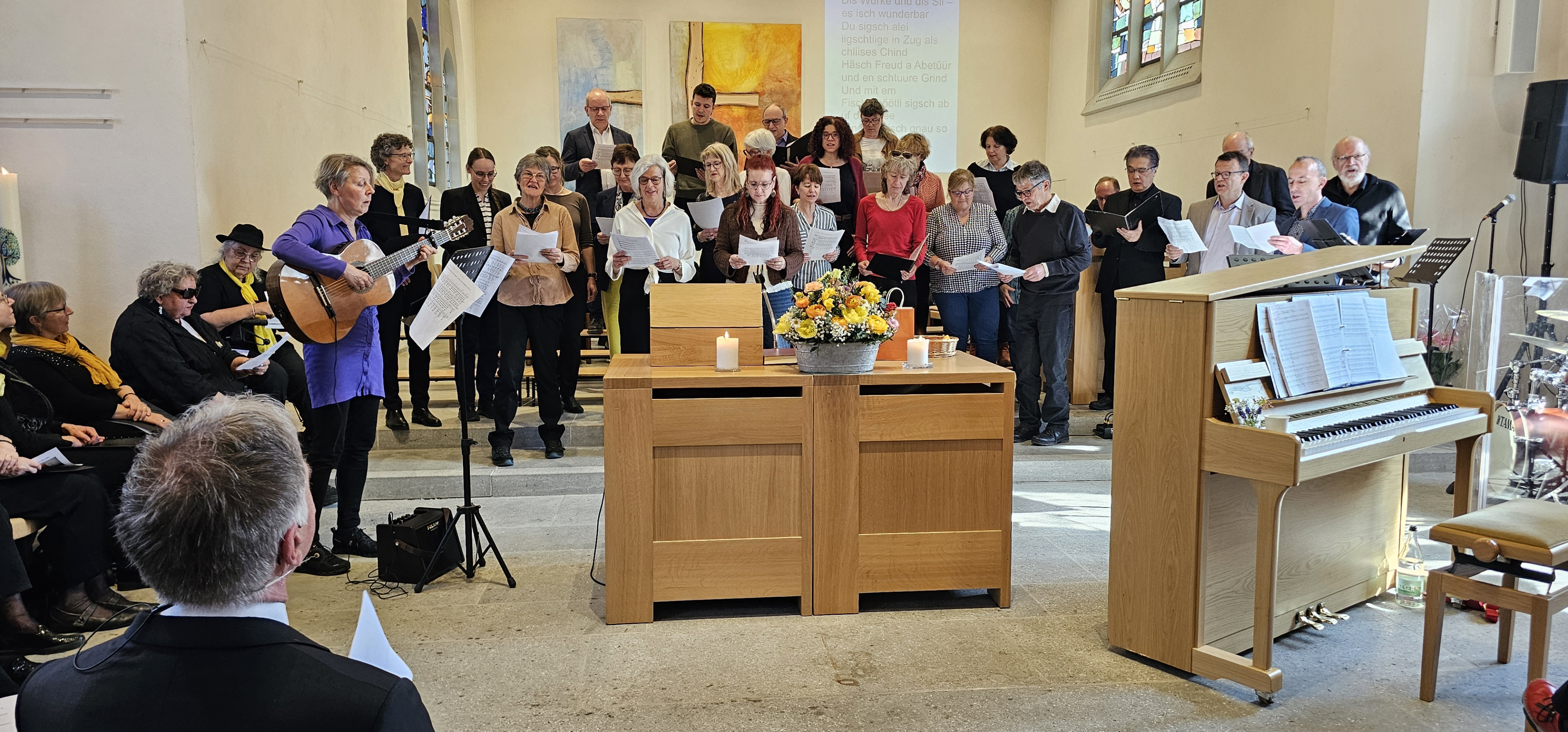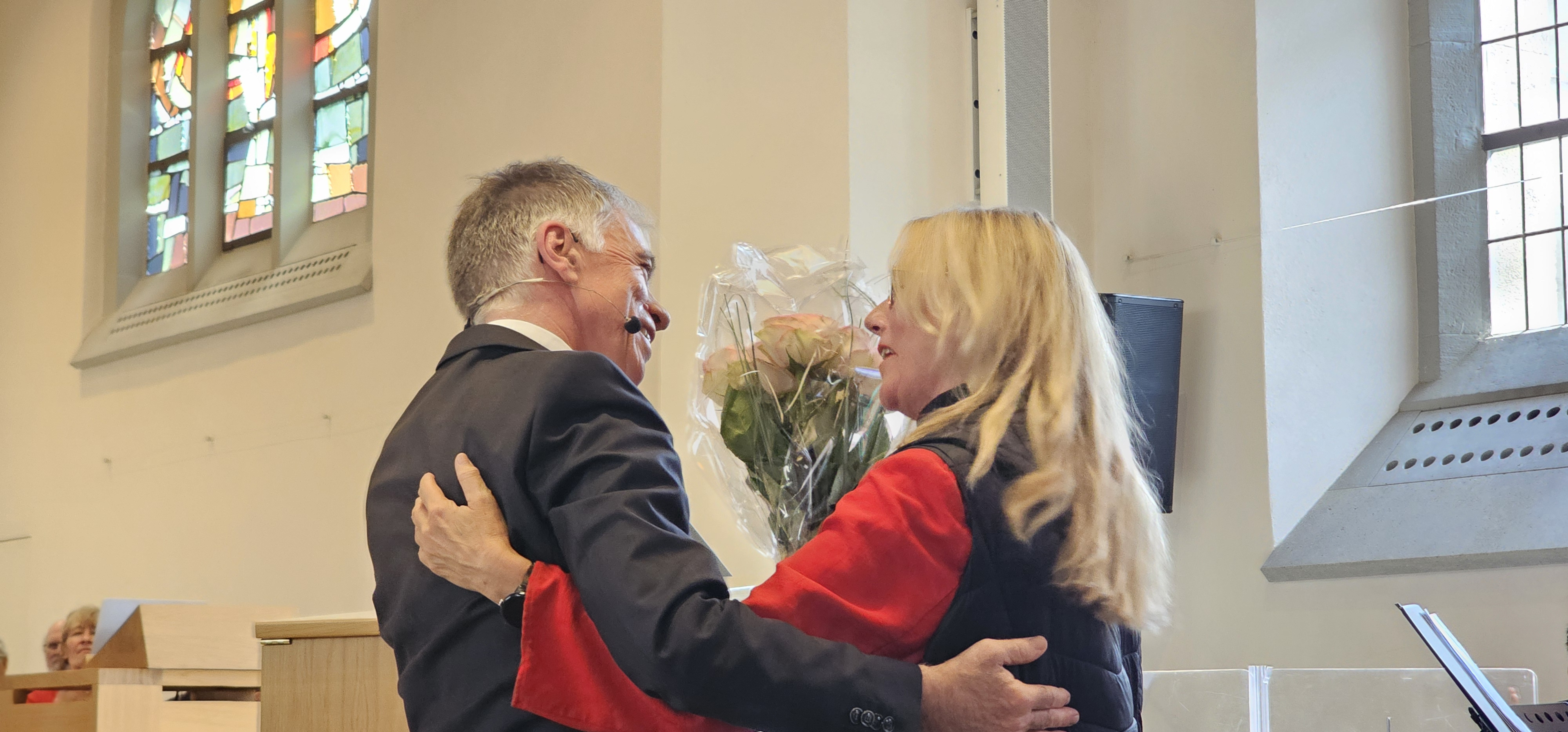 Es war dies einer der Momente, in denen die Gemeinde spontan applaudierte. Auch als Leszek Christine dankte, wurde mitten in der Predigt langanhaltend geklatscht. Und als dem scheidenden Pfarrer von der Kirchenpflege ein Blumenstrauss überreicht wurde, wollten die stehenden Ovationen nicht enden. Zuvor hatten Mitarbeitende und Mitglieder der Kirchenpflege in einem Medley von umgedichteten Kirchenliedern Leszeks Werden, Wirken und Wesen besungen. Dabei wurde u.a. daran erinnert, wie er einst als kleiner Bub von zuhause ausgebüxt sei: „Mit em Fischerböötli bisch ab uf offni See / Din Geist isch gnau so offe, und s Herz no mee“. Und auf die Melodie des nachdenklichen Jahresend-Lieds „Der du die Zeit in Händen hast“ hiess es nun: „Du häsch Humor, Schlagfertigkeit / Kei Pointe vo dir abverheit / Tuesch filme wien en Profi / Schriibsch s Drääbuech und füersch au Regie / Bisch by the way es Sprachgenie / Kei Chance gäg dii hät d KI.»