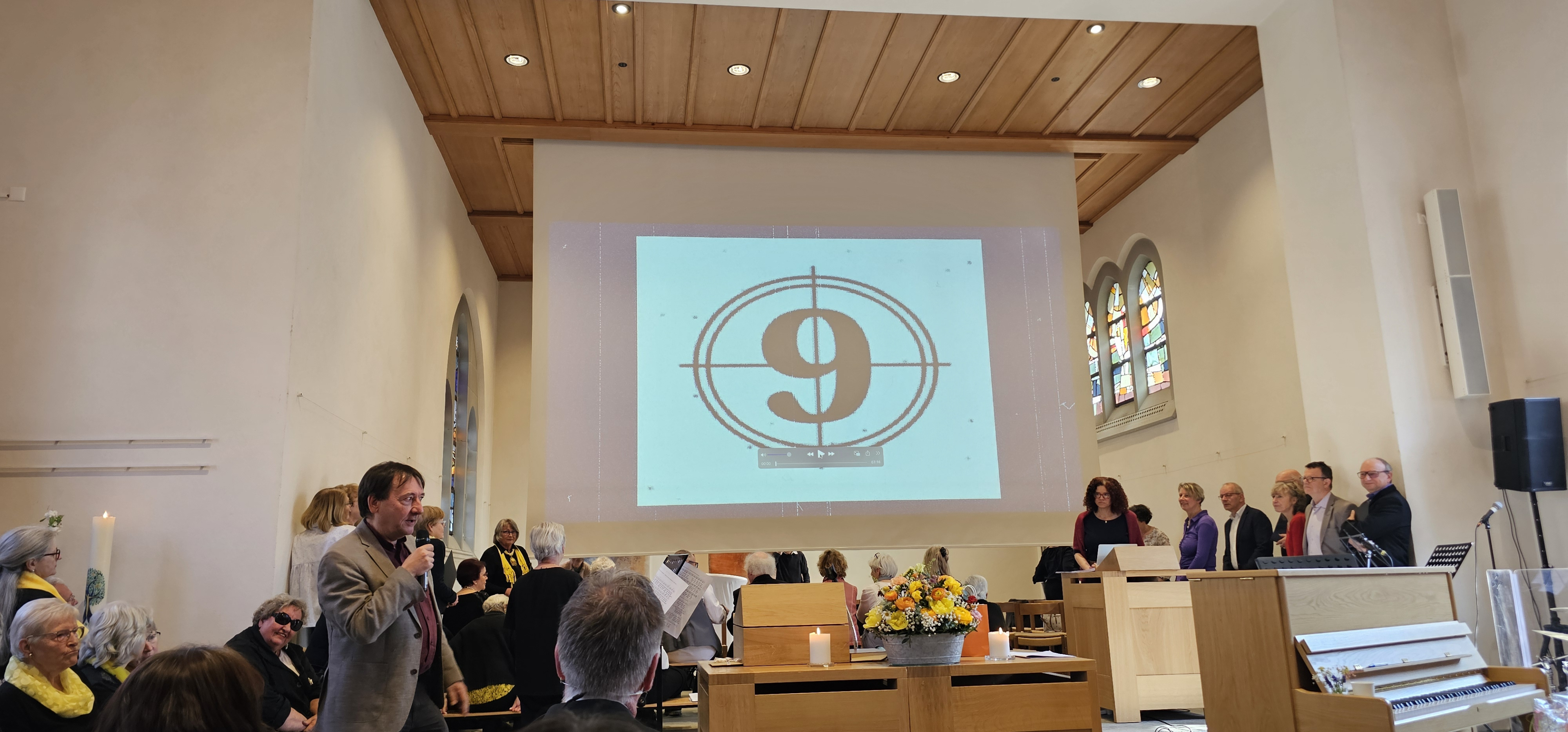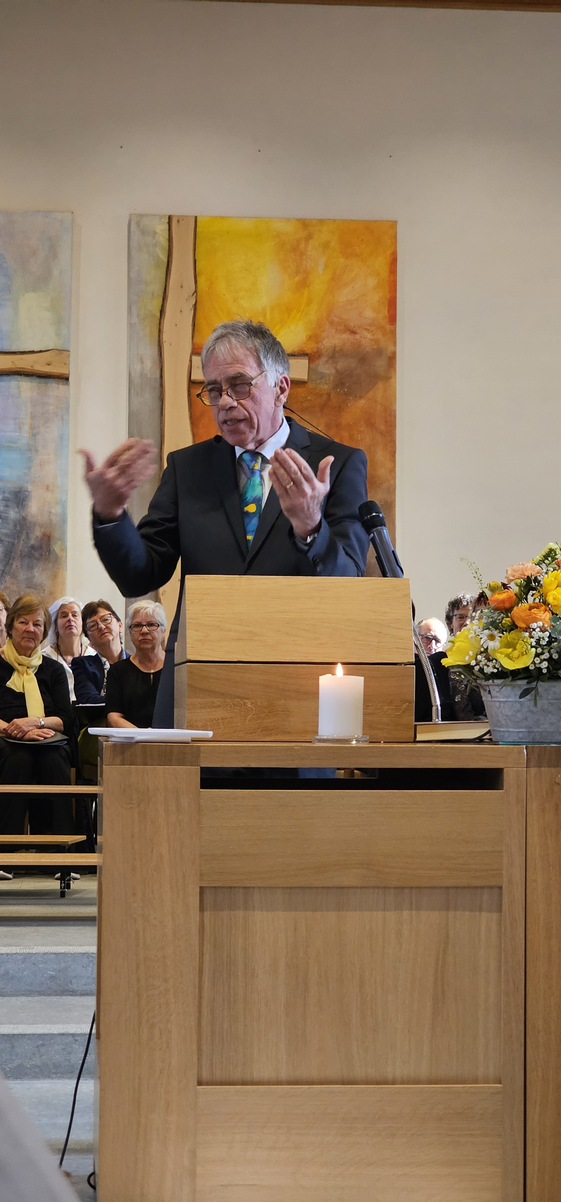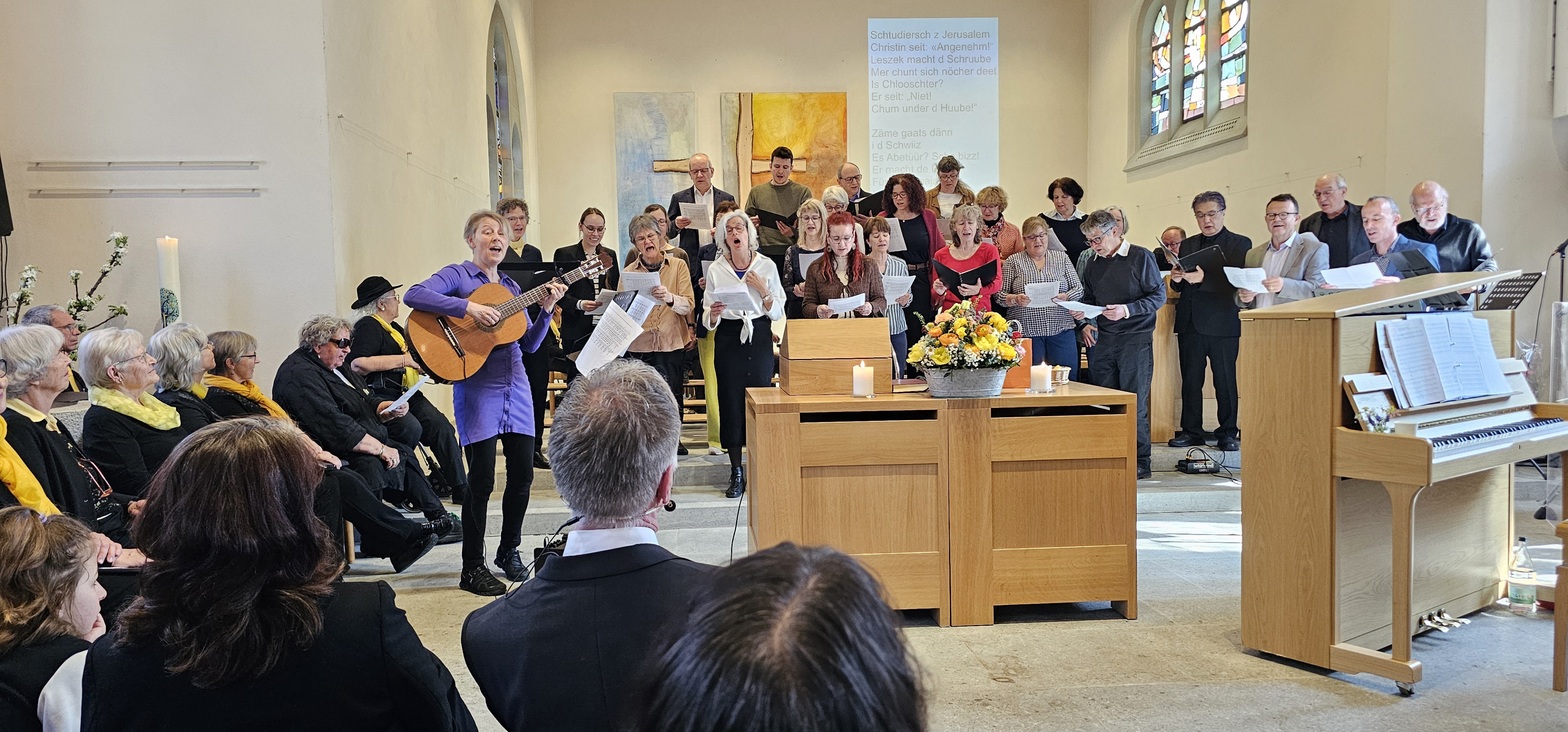 Es war dies einer der Momente, in denen die Gemeinde spontan applaudierte. Auch als Leszek Christine dankte, wurde mitten in der Predigt langanhaltend geklatscht. Und als dem scheidenden Pfarrer von der Kirchenpflege ein Blumenstrauss überreicht wurde, wollten die stehenden Ovationen nicht enden. Zuvor hatten Mitarbeitende und Mitglieder der Kirchenpflege in einem Medley von umgedichteten Kirchenliedern Leszeks Werden, Wirken und Wesen besungen. Dabei wurde u.a. daran erinnert, wie er einst als kleiner Bub von zuhause ausgebüxt sei: „Mit em Fischerböötli bisch ab uf offni See / Din Geist isch gnau so offe, und s Herz no mee“. Und auf die Melodie des nachdenklichen Jahresend-Lieds „Der du die Zeit in Händen hast“ hiess es nun: „Du häsch Humor, Schlagfertigkeit / Kei Pointe vo dir abverheit / Tuesch filme wien en Profi / Schriibsch s Drääbuech und füersch au Regie / Bisch by the way es Sprachgenie / Kei Chance gäg dii hät d KI.»