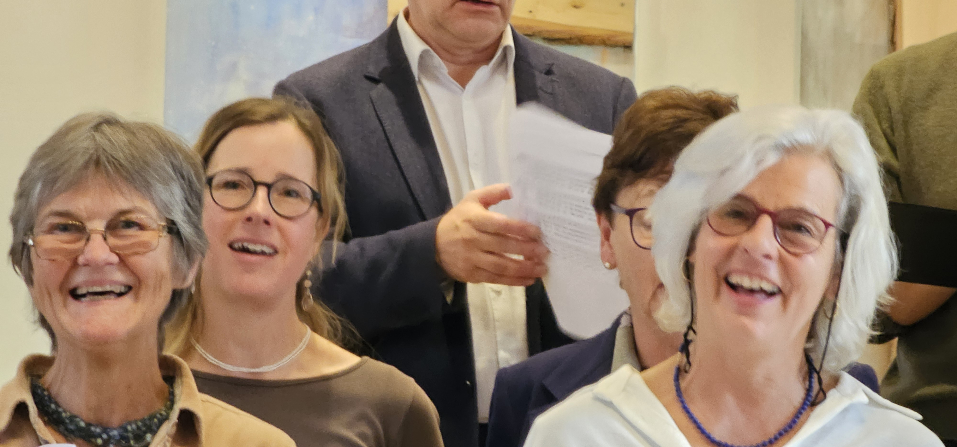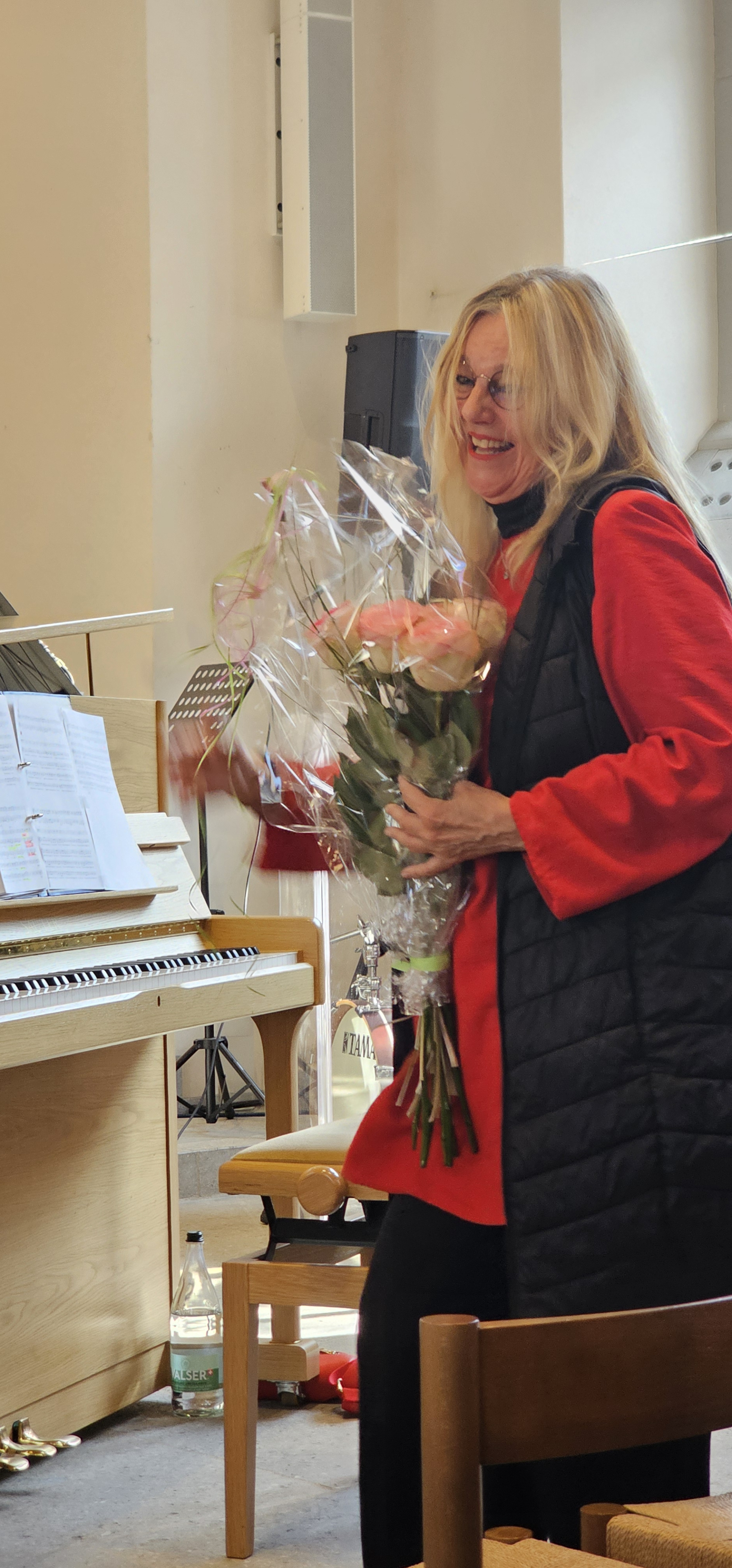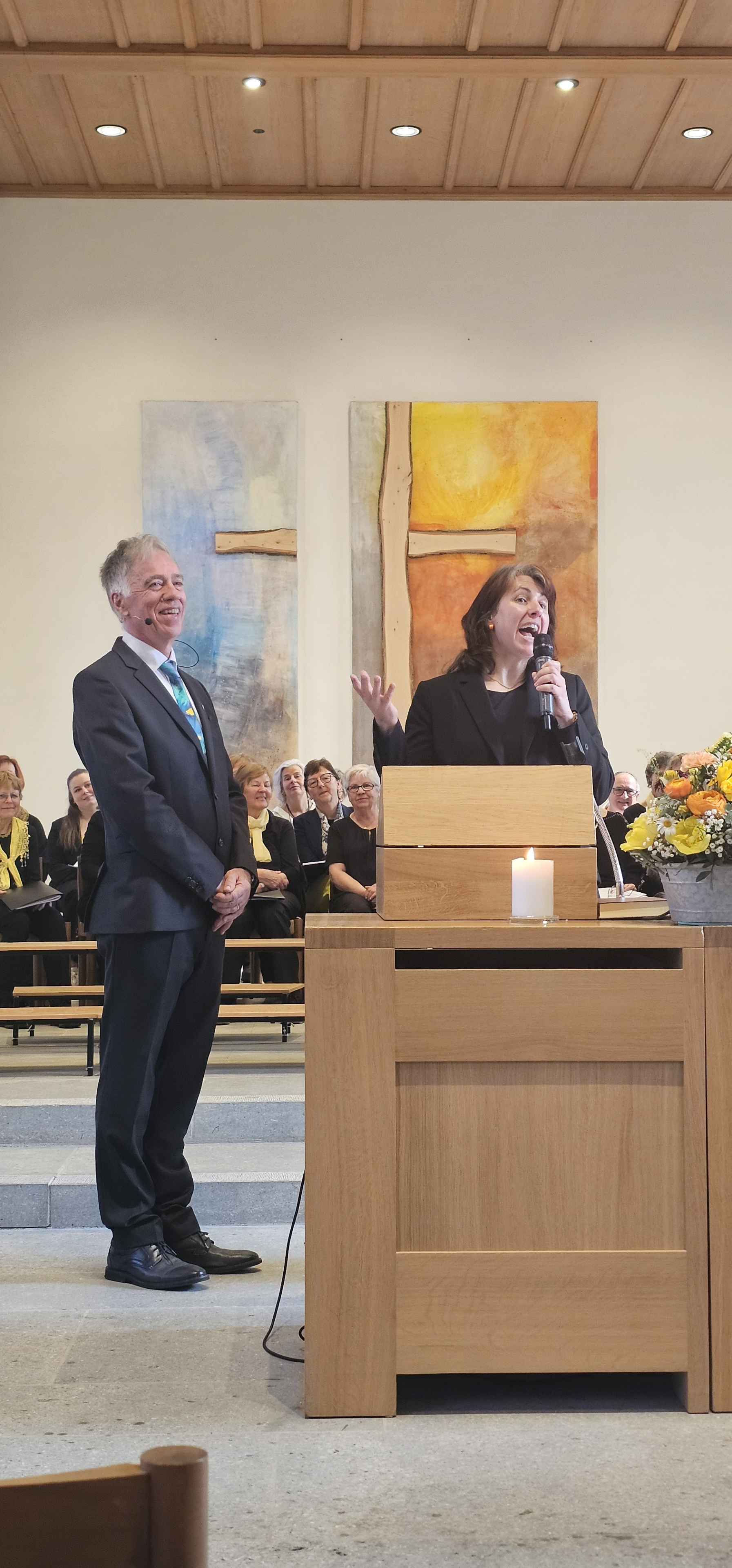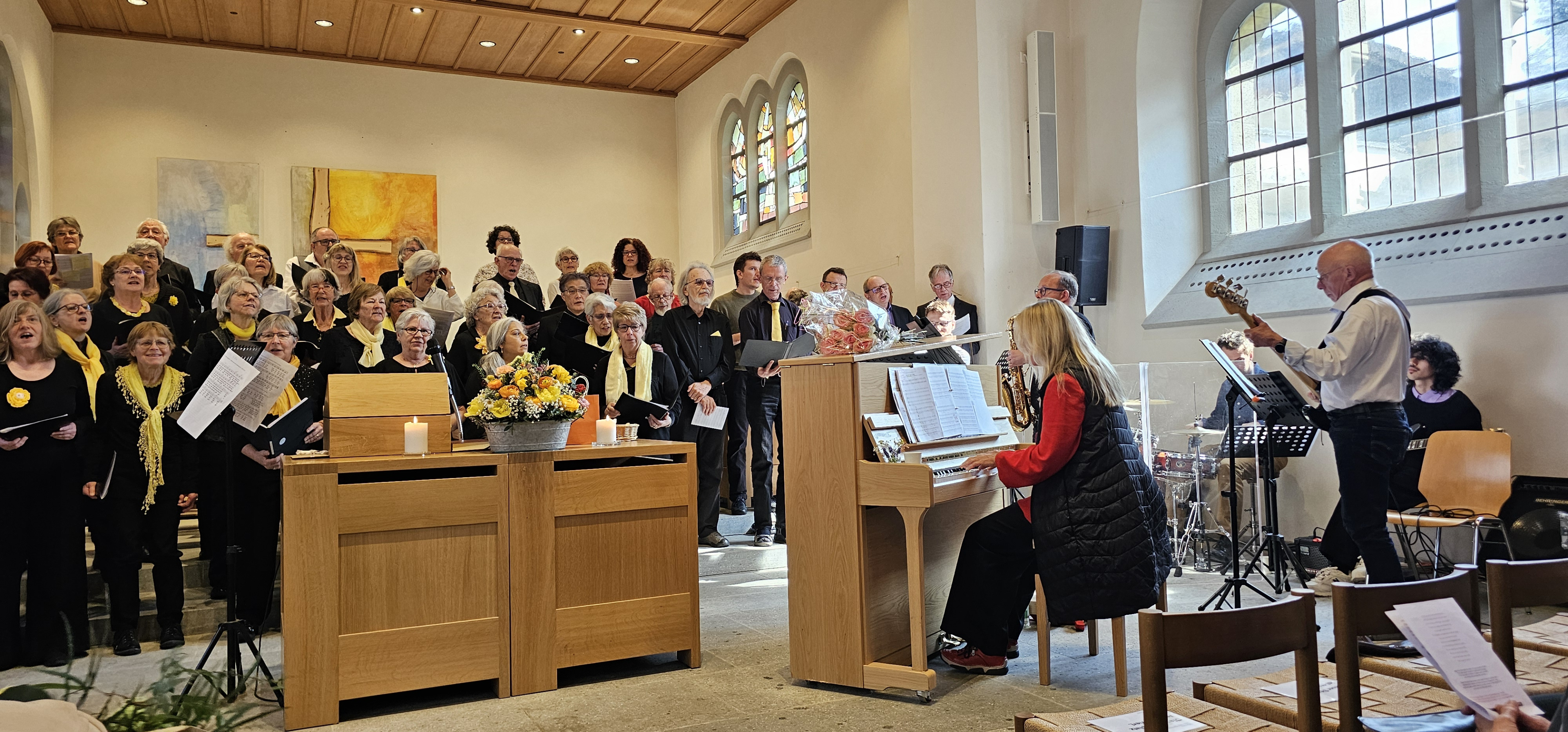 Es war dies einer der Momente, in denen die Gemeinde spontan applaudierte. Auch als Leszek Christine dankte, wurde mitten in der Predigt langanhaltend geklatscht. Und als dem scheidenden Pfarrer von der Kirchenpflege ein Blumenstrauss überreicht wurde, wollten die stehenden Ovationen nicht enden. Zuvor hatten Mitarbeitende und Mitglieder der Kirchenpflege in einem Medley von umgedichteten Kirchenliedern Leszeks Werden, Wirken und Wesen besungen. Dabei wurde u.a. daran erinnert, wie er einst als kleiner Bub von zuhause ausgebüxt sei: „Mit em Fischerböötli bisch ab uf offni See / Din Geist isch gnau so offe, und s Herz no mee“. Und auf die Melodie des nachdenklichen Jahresend-Lieds „Der du die Zeit in Händen hast“ hiess es nun: „Du häsch Humor, Schlagfertigkeit / Kei Pointe vo dir abverheit / Tuesch filme wien en Profi / Schriibsch s Drääbuech und füersch au Regie / Bisch by the way es Sprachgenie / Kei Chance gäg dii hät d KI.»