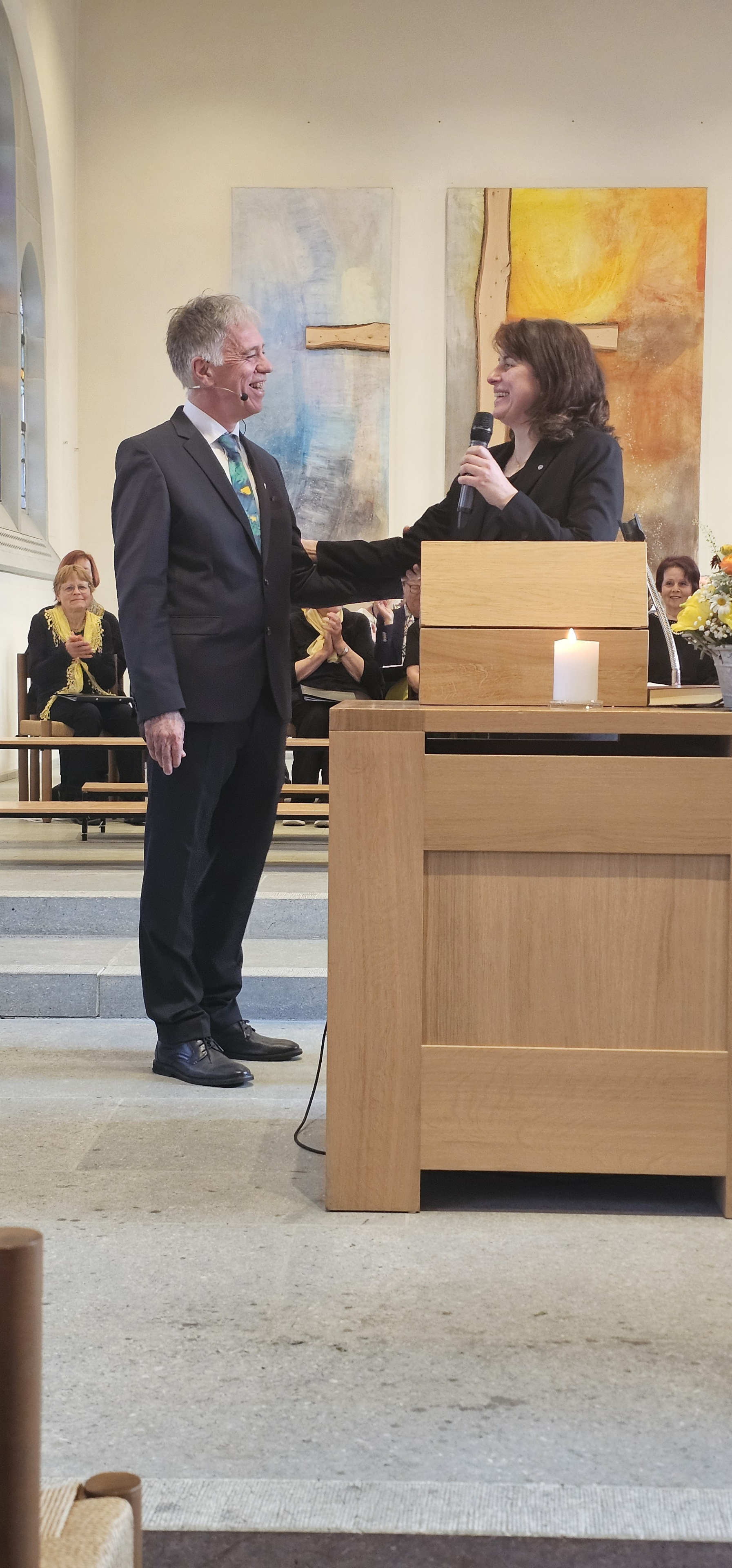 Auch Dekanin Pfarrerin Noemi Breda hat eine lange gemeinsame Geschichte mit Leszek Ruszkowski: Sie lernte ihn schon als junge Theologiestudentin kennen und war später mit ihm zusammen in der Leitung des Dekanats Brugg. Ihr kam die Aufgabe zu, den Kollegen vom Gelübde, das er einst bei seiner Einsetzung abgelegt hatte, zu entpflichten und ihm den Segen für den kommenden Lebensabschnitt zuzusprechen.