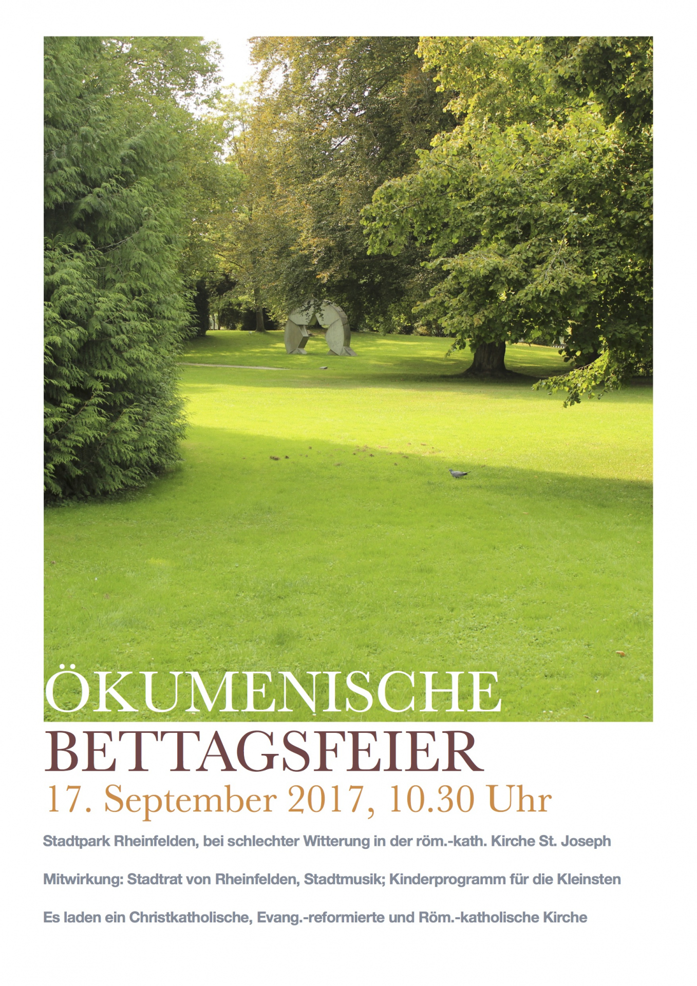 Pfarreikoordinatorin Linda Gaeta, Pfr. Peter Grüter; Pfr. Leszek Ruszkowski; Mitwirkung einer Vertretung des Stadtrates und der Stadtmusik Rheinfelden; bei schlechter Witterung in der röm.-kath. St. Joseph-Kirche; während dem Gottesdienst Kinderprogramm, anschliessend Apéro